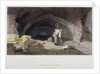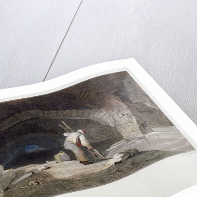 Interior of the Fleet Ditch at the back of Field Lane, City of London, 1851. Showing a man holding a ladder, behind him lies part of a mammal's skeleton.