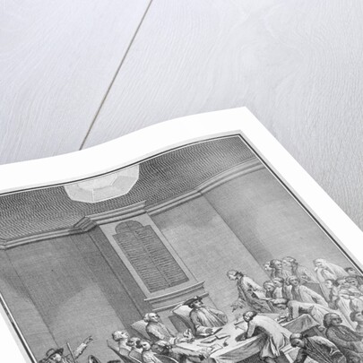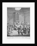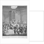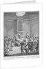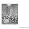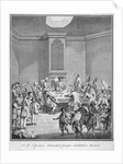 Interior view of the Marine Society's office over the Royal Exchange, City of London, 1758. In the foreground adults are directing poorly dressed children towards a basket of clothes, behind them figures sit around a table carrying out paper work.