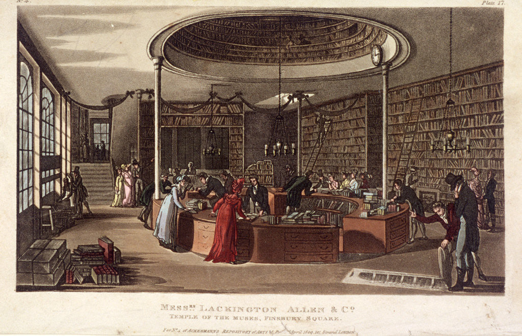 Interior view of the Temple of the Muses bookshop, Finsbury, London, 1809. The bookshop was run by Lackington, Allen and Co.