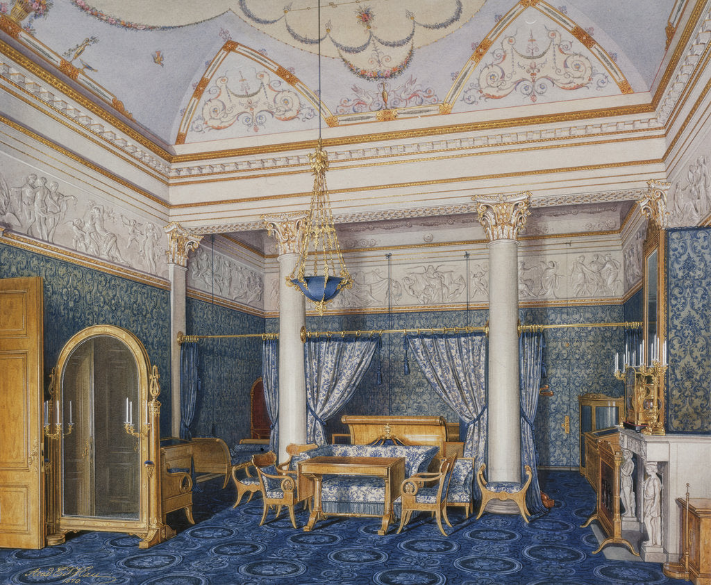 Interiors of the Winter Palace. The Bedchamber of Empress Alexandra Fyodorovna, 1870. Found in the collection of the State Hermitage, St. Petersburg.