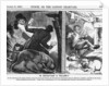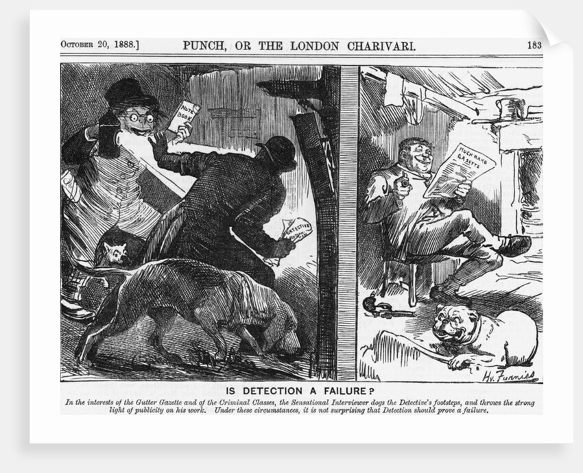 'Is Detection a Failure?', 1888. Punch points out the drawbacks inherent in the footsteps of the policeman being dogged by journalists. While the detective's work is making headline news on the 'Muckrake Gazette, the criminal is able to take his ease at home and wait for a quieter time to return to business. From Punch, or the London Charivari, October 20, 1888.