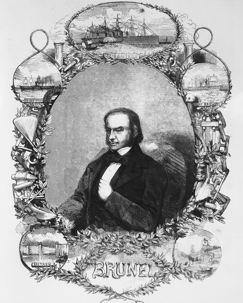 Isambard Kingdom Brunel, English engineer, c1850s. Brunel surrounded by vignettes of some of his most significant projects - the steamships 'Great Eastern', 'Great Britain', and 'Great Western' and the Saltash and Hungerford bridges. Brunel initially work for his father Marc Isambard Brunel on the construction of the Thames Tunnel. He was the chief engineer of the Great Western Railway (GWR) from 1833 to 1858, for whom he designed many bridges and viaducts, including the Royal Albert Bridge, Cornwall, and Clifton Suspension Bridge.