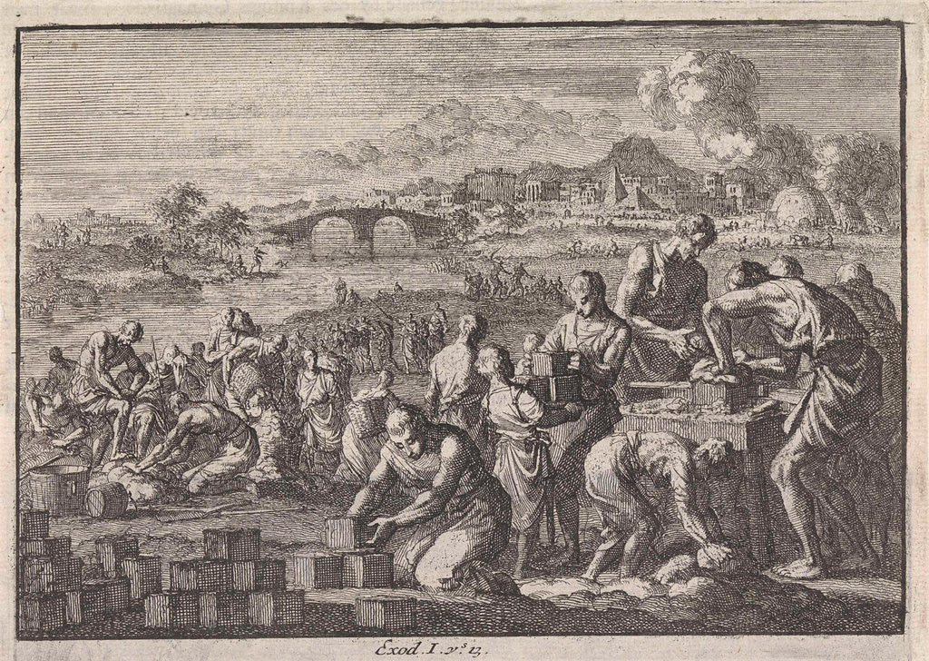 Israelites work as slaves in Egypt, Jan Luyken, Pieter Mortier, 1703 - 1762