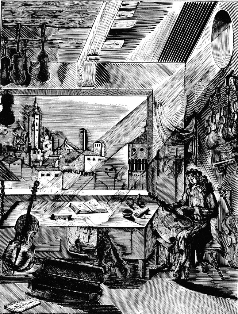Product images of Italian musical instrument maker Antonio Stradivari in his workshop, (1926).
