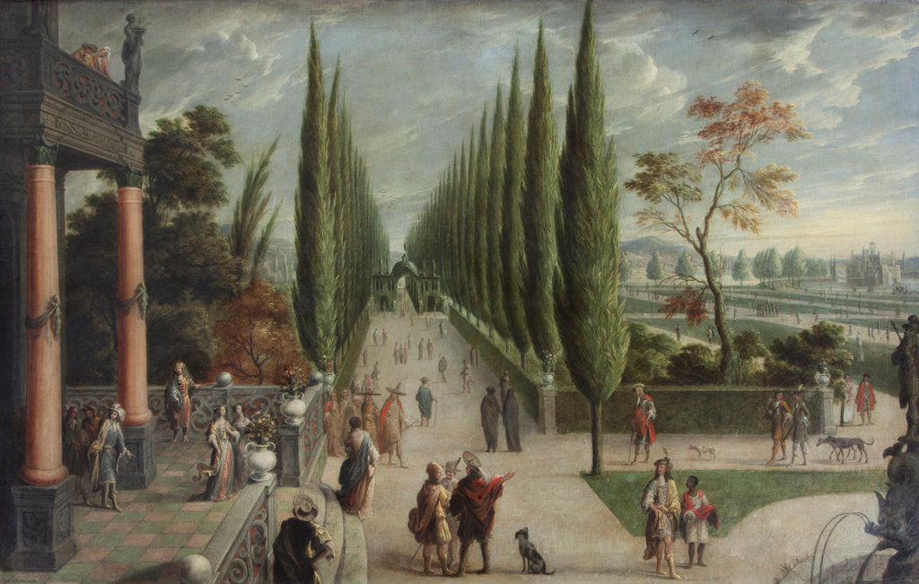 Garden landscape with promenading figures. A central avenue of poplar trees leads to a domed gate-house in the middle distance. To the left foreground is a portico through which four visitors enter the scene and on the balcony above, two onlookers. A short flight of steps with two ladies in conversation at the top leads to the avenue. In the centre foreground are a group of three men with a dog and further to the right a gentleman with a black servant-boy or attendant. A decorative fountain occupies the extreme right of the painting and beyond this is a park landscape with paths and figures. In the distance, a house or castle with a moat.