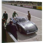 Jackie Stewart getting into a Rover BRM turbine, Le Mans, France, 1965. He has a band of tartan around his crash helmet. Graham Hill is to the right of the car.