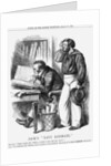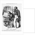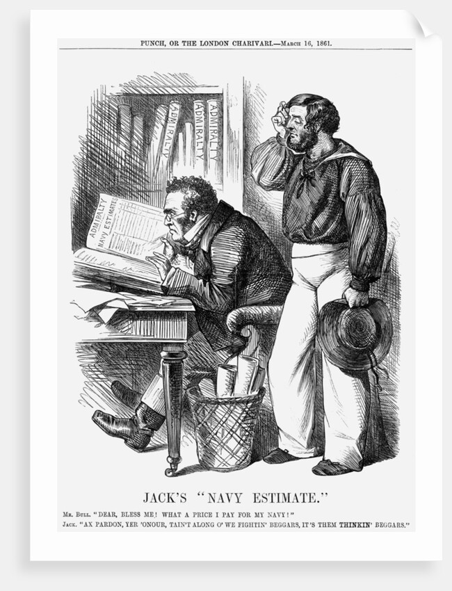 'Jack's Navy Estimate', 1861. John Bull exclaims over the amount of money to be allocated to the Navy, while Jack Tar, scratching his head, says that the men charged with protecting the nation see little of it. In March 1861, Lord Clarence Paget published his Navy Estimates which showed the funds required being some £12m. In the belief that France was pouring funds into her navy to bring it up to the standard of the British Navy, it was essential, said Lord Paget, that increasing funds were made available to the nation's navy to ensure that recent developments in the use of iron for ships were advanced. From Punch, or the London Charivari, March 16, 1861.