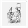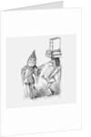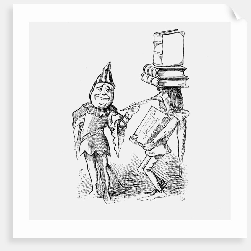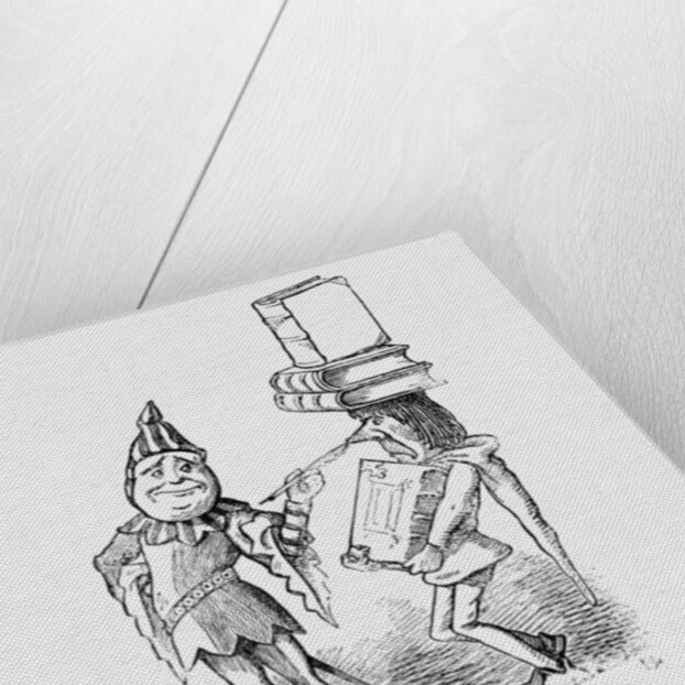Jester tickling a man carrying books, 1867. A court jester tickles the nose of an unfortunate man who has his arms so full of books that some have had to be balanced on his head. From Punch, or the London Charivari, December 28, 1867.