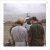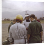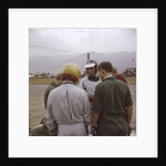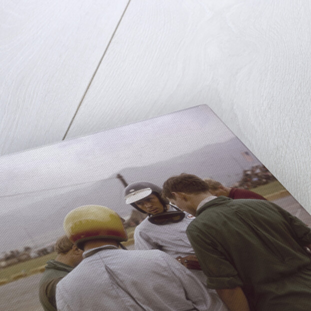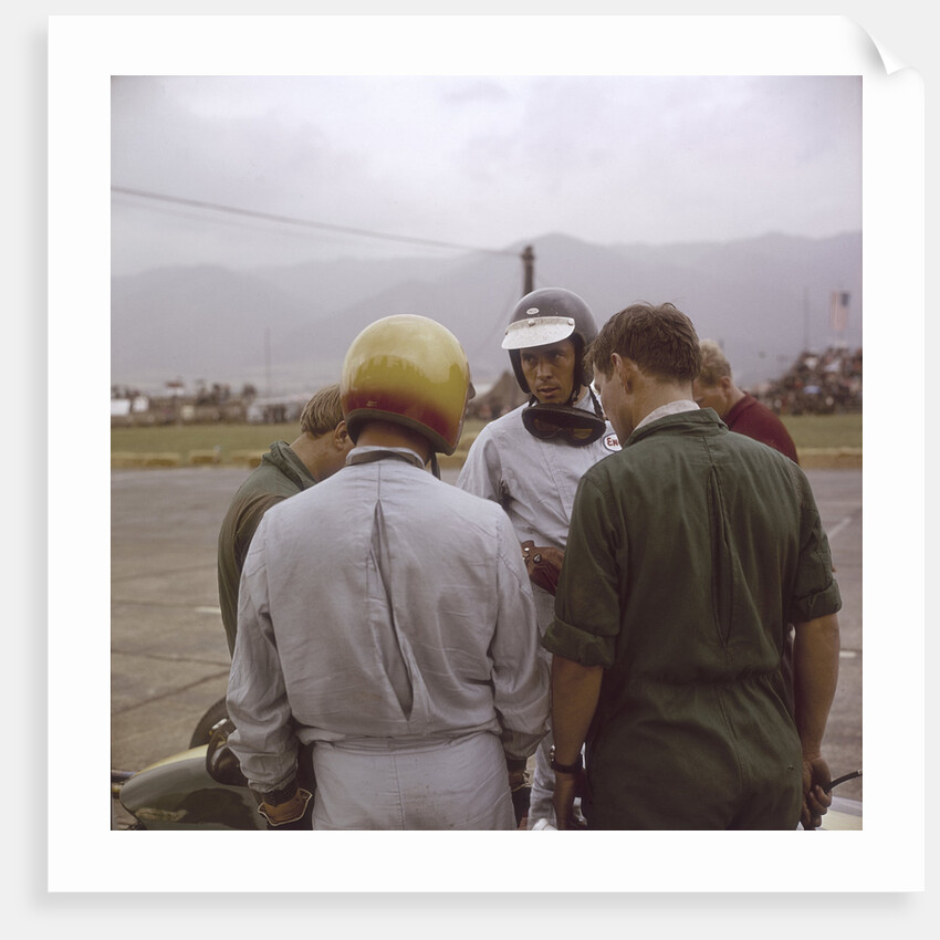 Jim Clark at the Austrian Grand Prix, Zeltweg, Austria,1964. In the blue crash helmet and goggles round his neck. Talking to another driver and mechanics. Clark did not finish this race due to broken driveshafts.