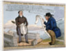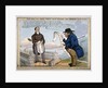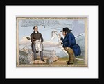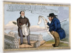 'John Bull & the arch-itect wot builds the arches - &c - &c - &c - &c', 1829. John Nash standing between the two wings of Buckingham Palace confronted by John Bull, holding a long scroll. The two men are separated by Marble Arch. Nash was commissioned in 1825 to remodel the then Buckingham House into Buckingham Palace and to build the Royal Mews and Marble Arch.
