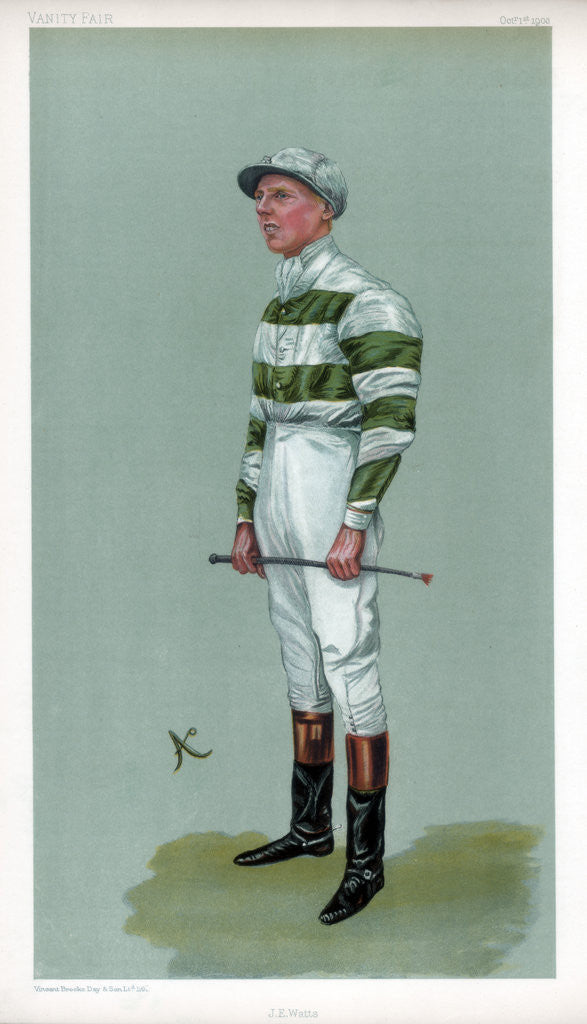 John Evelyn Watts, British jockey, 1903. Watts followed in his father's footseps as a jockey and later as a racehorse trainer. Cartoon from Vanity Fair, 1st October 1903.