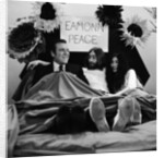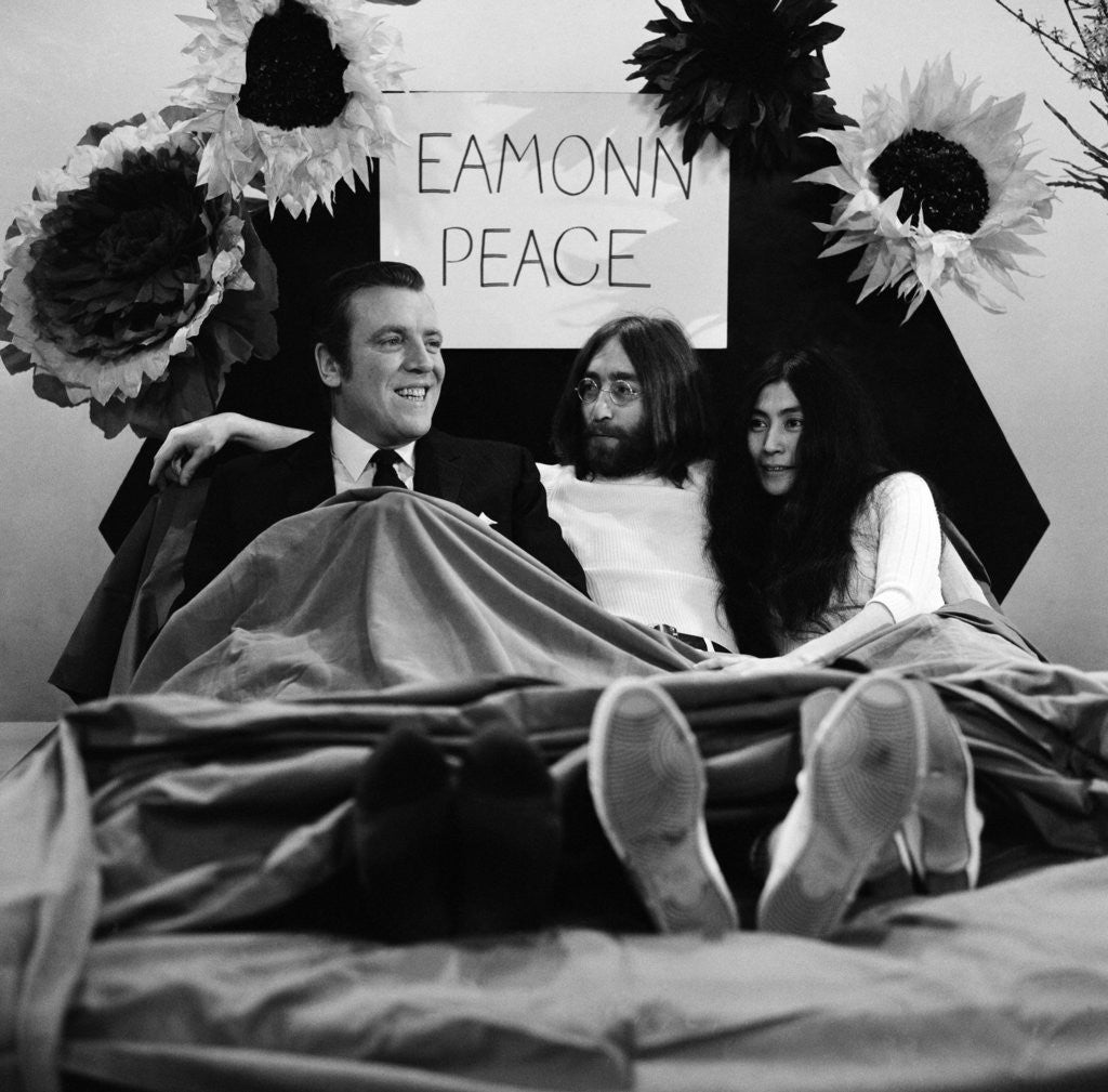 John Lennon and Yoko Ono appear on Thames Television's 'Today' programme with Eamonn Andrews. Eamonn started the programme in a bed and was joined by John and Yoko who emerged out of a bag at the bottom of the bed. 1st April 1969.