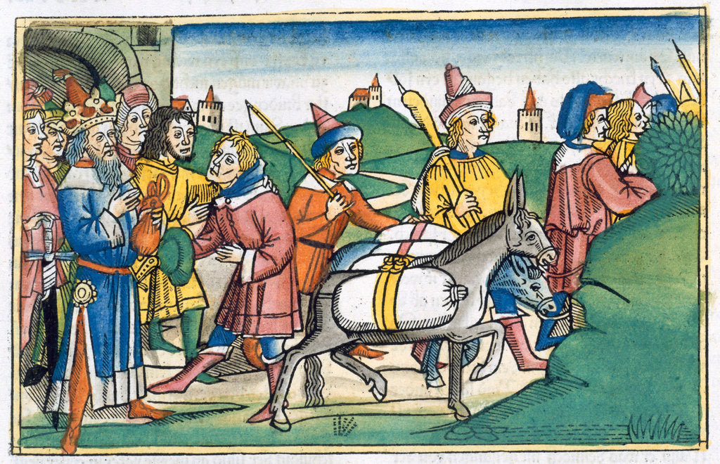 Joseph sends his brothers home with a supply of free food, 15th century. Bible scene (Genesis 42: 25-28). German School.