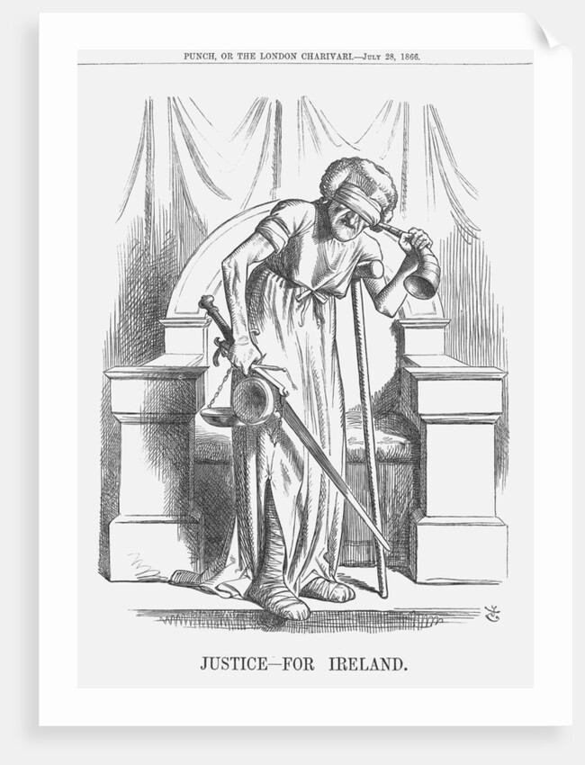 'Justice - For Ireland', 1866. Madame Justice is depicted here as blinded, deaf and lame. This cartoon is accompanied by a short poem entitled 'Justitia Moritura' in which the point is made that if Justice will not see, will not listen, and cannot move, then it is to all intents and purposes, dead. The poem and the cartoon were suggested by Irish legal appointments. From Punch, or the London Charivari, July 28, 1866.