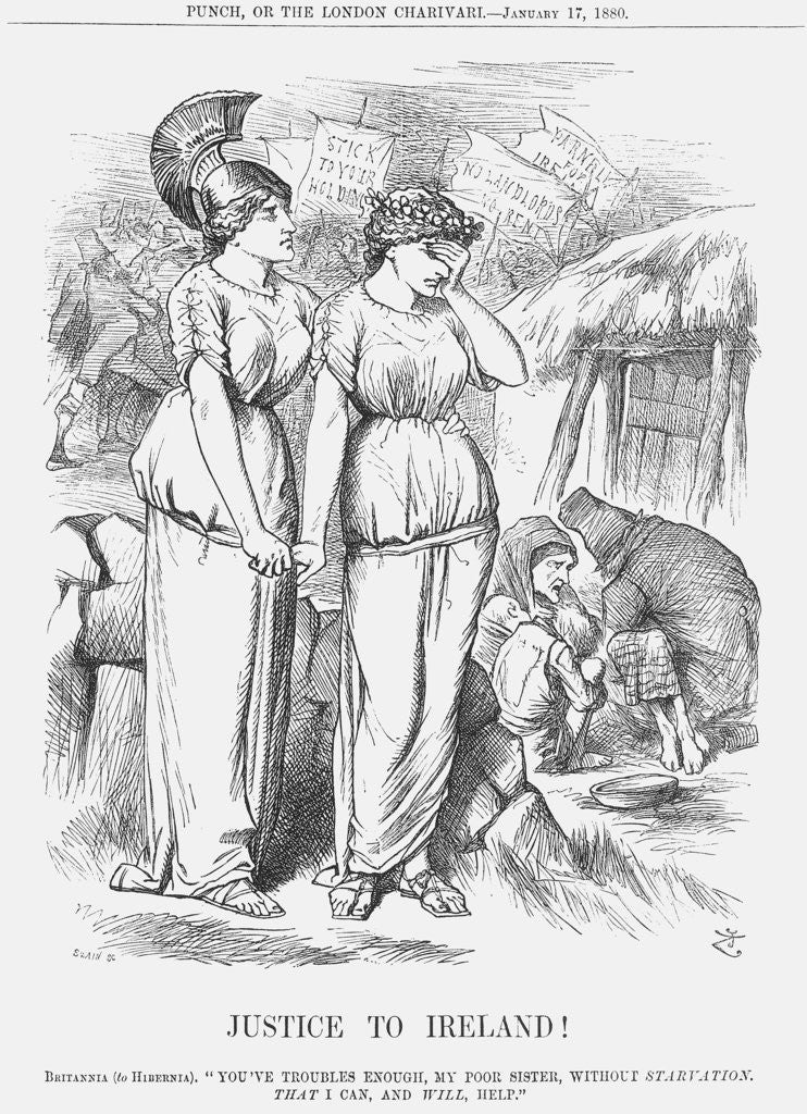 'Justice to Ireland', 1880. Britannia comforts a tearful Hibernia. To the right of the cartoon, an Irish family is on the brink of starvation whilst, in the background, a march takes place. This relates to a scarcity of food in Ireland at the beginning of the year. Charles Parnell made a visit to New York at that time where he said that the only help that Ireland needed was to free herself from British landlords and the land rental system which was responsible for bringing such poverty. There was much agitation in Ireland at the time against the payment of rent, whilst relief funds collected by such people as the Lord Mayor of Dublin and the Duchess of Marlborough were used to prevent a real famine. From Punch, or the London Charivari, January 17, 1880.