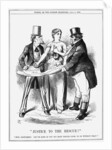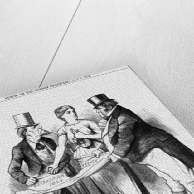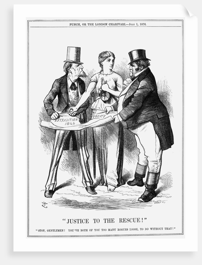 Justice to the Rescue!, 1876. Uncle Sam and John Bull, representing Britain and the United States of America, are tearing up the Extradition Treaty of 1842. The allegorical figure of Justice, identifiable by her sword and scales, intervenes, saying: 'Stop, gentlemen! You've both of you too many rogues loose, to do without that!'. The extradition treaty was a clause dealing with the mutual extradition of criminals and was part of the Webster-Ashburton Treaty, an agreement between the United States and Britain which was one of the many instances in which the two nations settled disputes without going to war. From Punch, or the London Charivari, July 1, 1876.