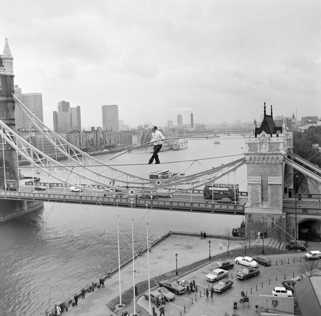 Karl Wallenda, Tightrope Walker, crosses 100ft above the ground, near Tower Bridge, London, Monday 22nd November 1976.