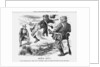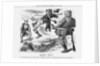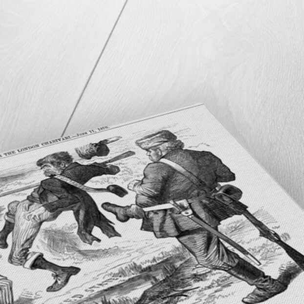 'Kick'd Out!!', 1870. A burly Canadian kicks a representative of the Irish Fenian movement out of Canada and back to America where President Grant is waiting. This relates to a long-running problem. In 1866, the American branch of the Irish Fenian movement had hatched plans, unsuccessful at the time, to invade Canada. Now, a further attempt had been made but, again, they were unsuccessful. Regular troops and Canadian volunteers had resisted their attack, and within only a few days, the United States had the Fenian leader, O'Neill, in custody. As is usual, the Fenian representative is depicted almost as an ape by Tenniel. He is also wearing trousers similar to those being worn by President Grant, and this refers to the fact that much of the funding of the Fenian movement, both in Ireland and in America, was funded by American sympathisers. From Punch, or the London Charivari, June 11, 1870.