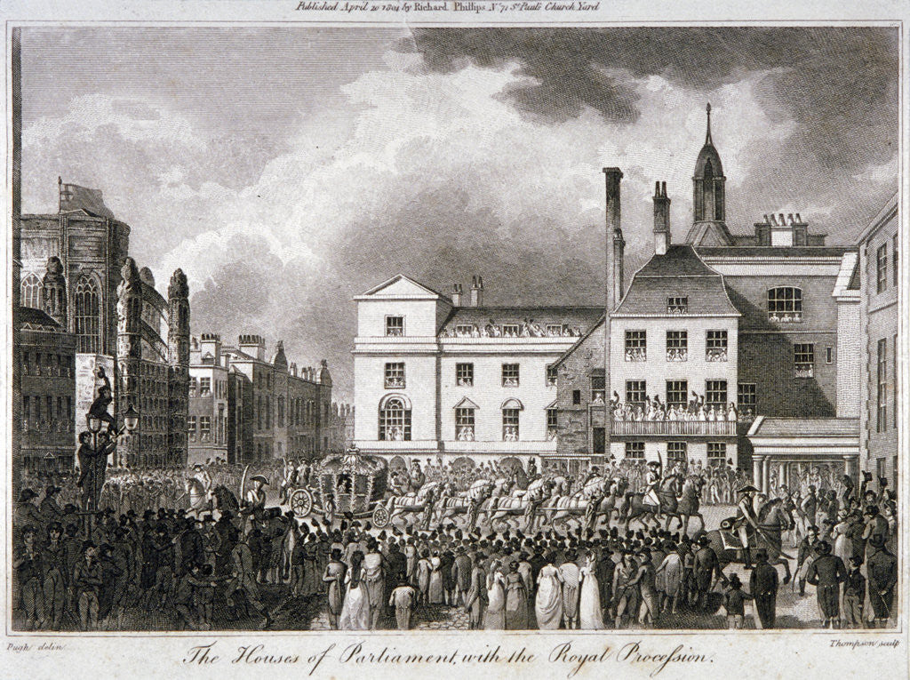 King George III processing through Old Palace Yard, Westminster, London, 1804. The yard is lined with onlookers.