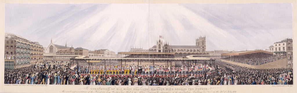 King George IV's Coronation Procession, London, 1821. Panoramic view of the royal procession from Westminster Hall to Westminster Abbey for King George IV's coronation. Crowds line the route, with grandstands for a better view. The procession is covered by an awning, and the sun shines down above the abbey.