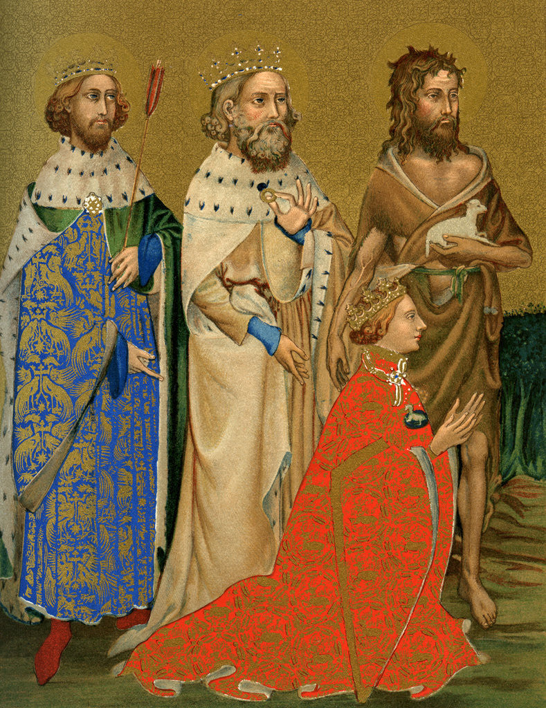 King Richard II of England and his patron saints, 14th century (1893). The reign of Richard II (1367-1400) was characterised by intermittent periods of tension between the king and the barons. In 1399 he was captured at Flint Castle in Wales before being taken to the Tower of London where he was forced to abdicate by Henry Bolingbroke, who declared himself King Henry IV. Richard was then imprisoned in Pontefract Castle where he either starved to death or was murdered early in 1400. An illustration from A Short History of the English People, by J R Green, illustrated edition, Volume II, Macmillan and Co, London, New York, 1893.