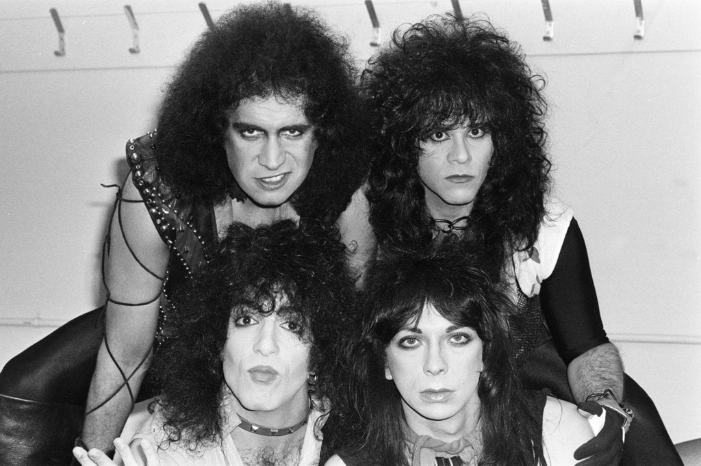 American rock group Kiss seen here in a very quick break between numbers at their concert at Wembley Arena, supposedly the first time they have been seen without their stage make up. Top row Left to right are: Gene Simmons and Eric Carr. Bottom row: Paul Stanley and Vinnie Vincent. 23rd October 1983.