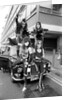 'Kiss', the spectacular and colourful American rock group arrived in Britain today for their European debut performances. The group will wear their heavily studded black and silver costumes with specially sculptured boots; they will appear in black, white and silver make-up - just like the forces of evil incarnate. Pictured standing on top of a car outside Heathrow airport are group members top left to right: Gene Simmons and Ace Frehley. Bottom: Paul Stanley and Peter Criss. 10th May 1976.