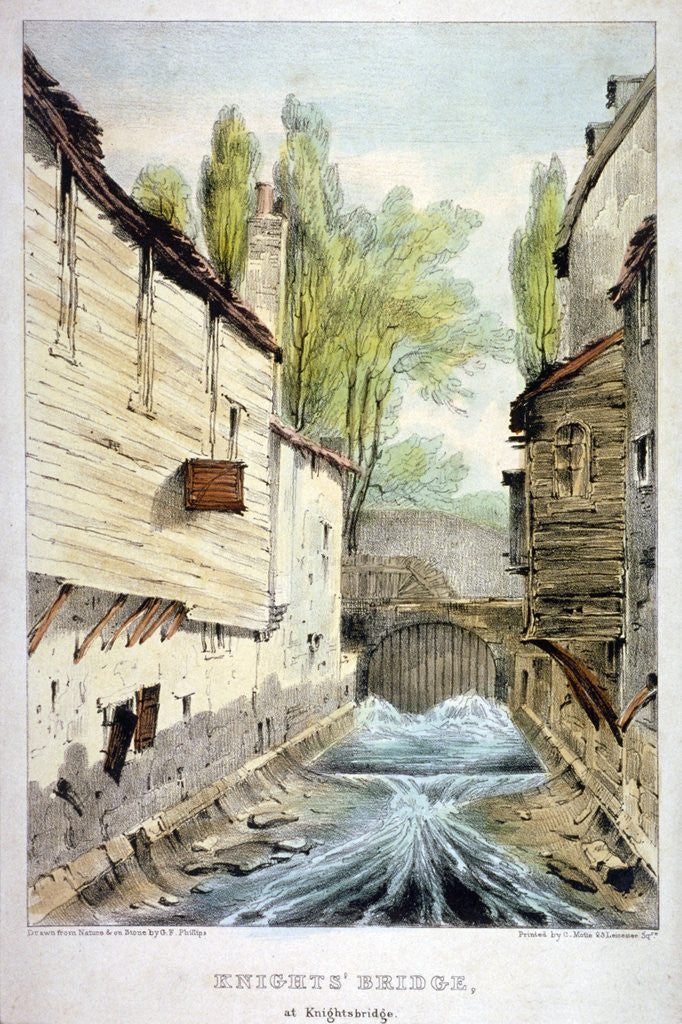 Knights' Bridge, Knightsbridge, Westminster, London, c1825. Knights' Bridge crossed the Westbourne River near the site of the present Albert Gate, Hyde Park.