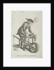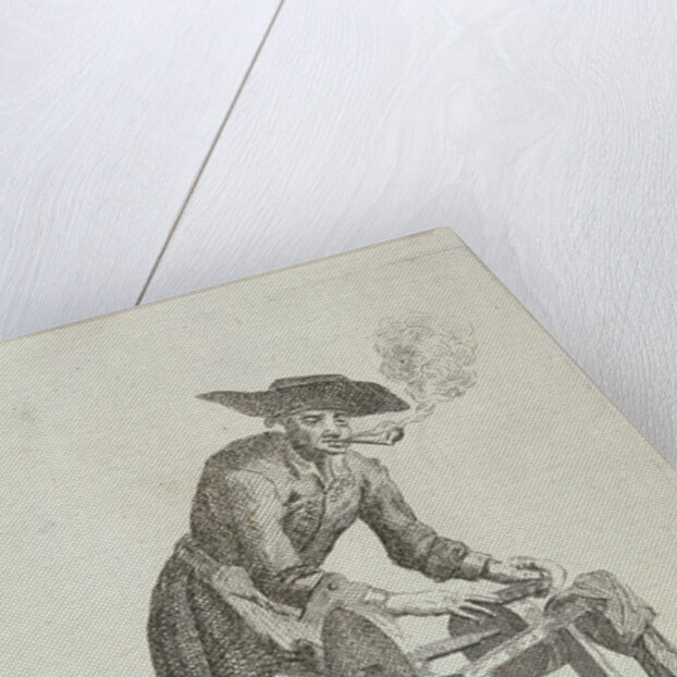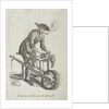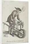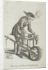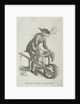 'Knives or Cisers to Grind'. A knife and scissors grinder at work, with his grindstones on a barrow improvised to transport them. He is smoking as he works. From Cries of London, c1750.