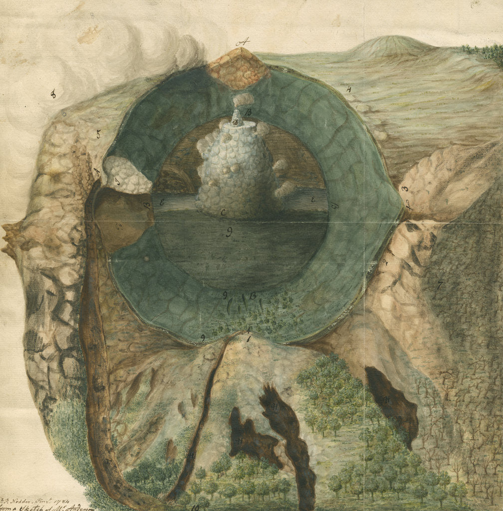 Plate 2 from the paper "An Account of Morne Garou, a Mountain in the Island of St. Vincent, with a Description of the Volcano on Its Summit. In a Letter from Mr. James Anderson, Surgeon, to Mr. Forsyth, His Majesty's Gardener at Kensington...", Philosophical Transactions of the Royal Society, vol.75 (1785), pp.16-31. Schematic painting showing the circumference of the crater, two lakes of water within it and a central cone issuing smoke. Other details include the forested slopes of the mountain with some hurricane-destroyed trees. Inscribed with publication details in pencil upper right. Signed and Inscribed lower left: "F.P.Nodder, Pinxt. 1784 from a sketch by Mr Anderson."