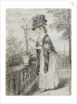 Lady on a Terrace Tending a Carnation Plant