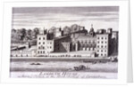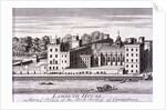 View of Lambeth Palace; in the foreground, a coach and horses being ferried across the River Thames.