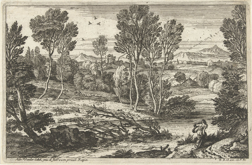 Landscape with woman walking along river, print maker: Adriaen van der Kabel, N. Robert, 1648 - 1705
