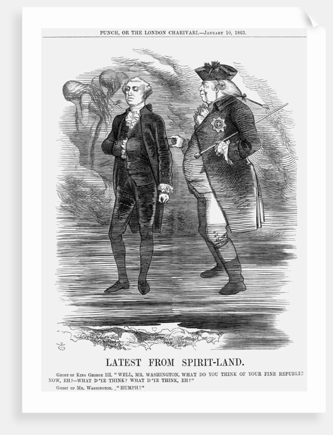 'Latest from Spirit-Land', 1863. Ghost of King George III says: Well, Mr. Washington, What Do You Think of Your Fine Republic Now, Eh? - What D'Ye Think? What D'YeThink, Eh? Ghost of Mr. Washington replies: Humph! As the American Civil War became more bitter, and showed no sign of reaching any peaceable conclusion, Punch here portrays King George III, whose troops were beaten by those led by General George Washington, the first President of the United States. The ghost of George is shown prodding the ghost of Washington, and asking rather smugly, what has become of Washington's beloved Republic. Washington has no answer. From Punch, or the London Charivari, January 10, 1863.