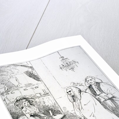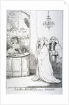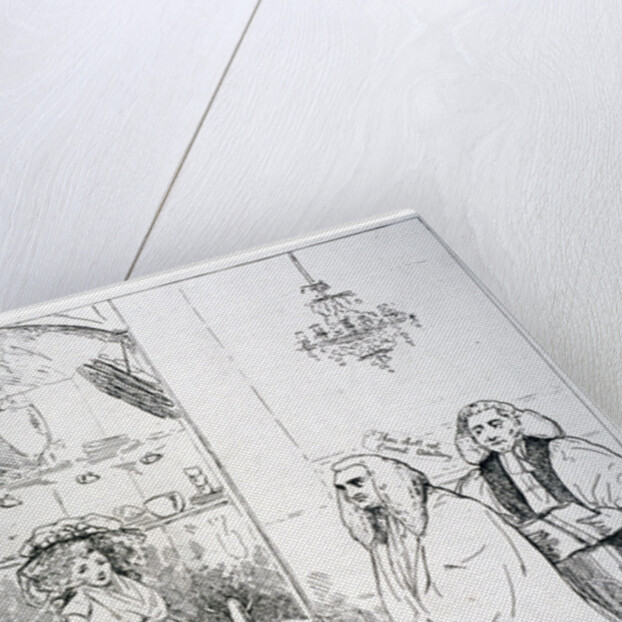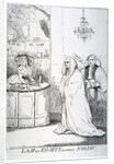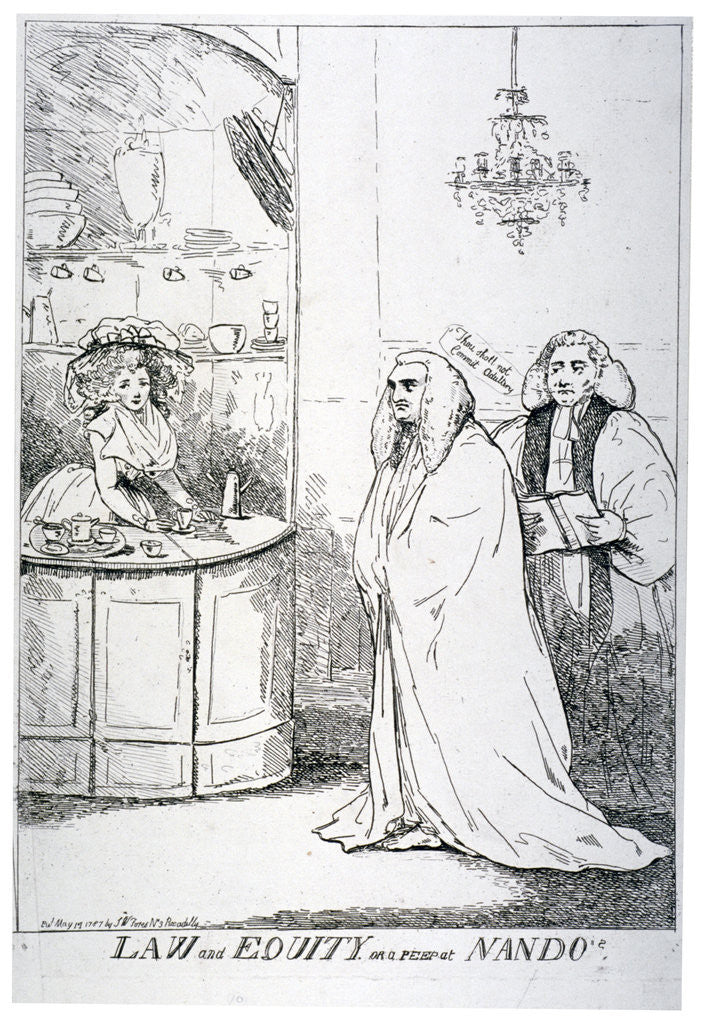 'Law and equity, or a peep at Nando's', 1787. Lord Edward Thurlow dressed as a penitent but with his Lord Chancellor's wig, is approaching Nando's Coffee House bar at which stands Mary Edmonds; a bishop is standing in the background.