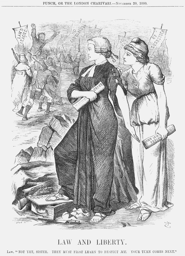 'Law and Liberty', 1880. Law and Liberty watch the unrest in Ireland. This relates to a conference, held on the 23rd October, at Dublin, at which the prosecution of Land League leaders was decided upon. Fourteen men were subsequently charged with conspiring to prevent the payment of rents, to defeat the legal enforcement of payment and to prevent evictions. At a speech given by the Liberal Prime Minister and Chancellor of the Exchequer, Mr Gladstone, it was made clear that although the need for reform was obvious, the current laws must in the interim be obeyed. From Punch, or the London Charivari, November 20, 1880.