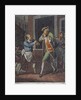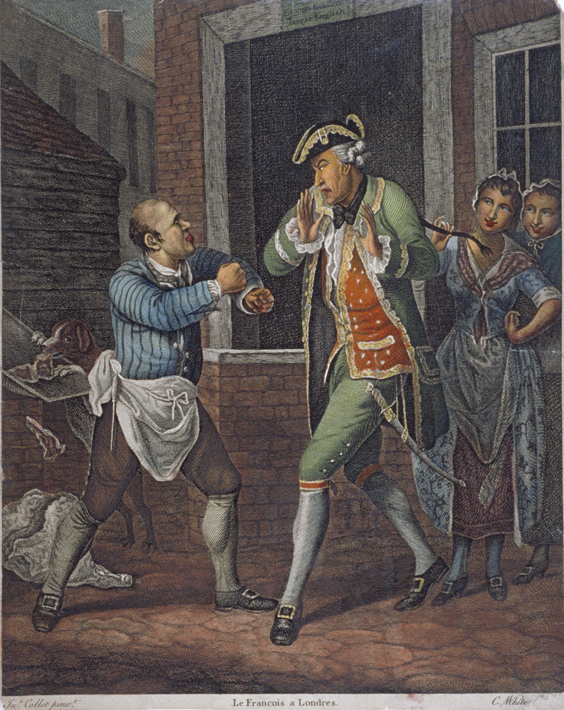 'Le Francois a Londres', 1770. A butcher, with doubled fists, menaces a French dandy, who holds up his hands in alarm, while one of two women behind him holds his pigtail.