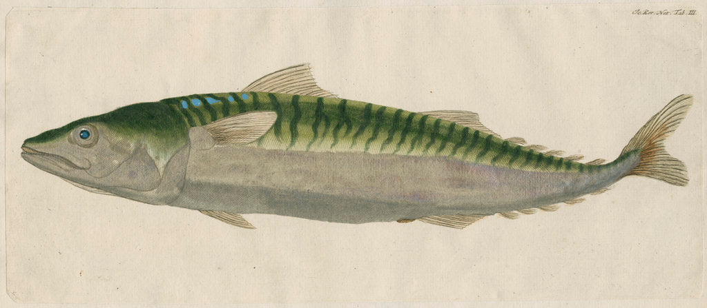 Marine zoological study showing a side view of the Atlantic mackerel (Scomber scombrus). Plate 3 from the book Icones rerum naturalium, ou figures enlumlinees d'histoire naturelle du Nord, by Peter Ascanius, volume 1 (Copenhagen, 1772). Inscribed upper right 'Ic. Rer. Nat. Tab. III.' Peter Ascanius was elected a Fellow of the Royal Society in 1755.