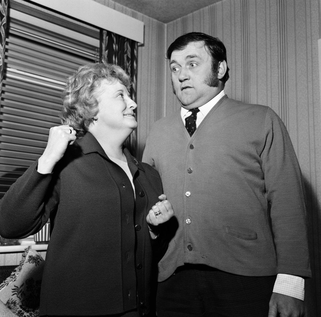 Comedian Les Dawson and his neighbour Mrs Winifred Rose, who both caught two intruders in Mrs Rose's home in Whitefield, near Manchester. 10th April 1969.