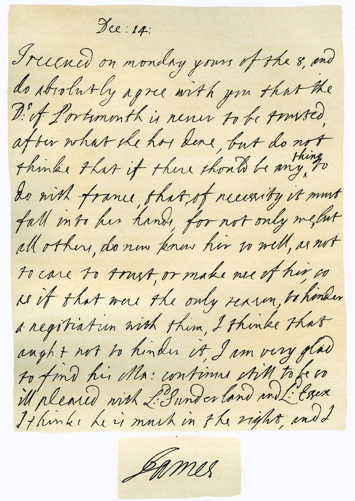 Letter from James II to his brother-in-law, Lawrence Hyde, First Lord of the Treasury, late 17th century. Letter written, as Duke of York, during his retirement in Scotland at the time of the Exclusion Bill, on the untrustworthiness of the Duchess of Portsmouth, proposed changes in the Ministry, the necessity of a dissolution of Parliament, the conviction of Lord Stafford for complicity in the Popish Plot, and his own determination not to change his religion. The detached signature is taken from a letter to Samuel Pepys (The Hague, 25th April, 1679). From the third series of Facsimiles of royal, historical, literary and other autographs in the Department of Manuscripts, British Museum: Series I-V, (London, 1899).
