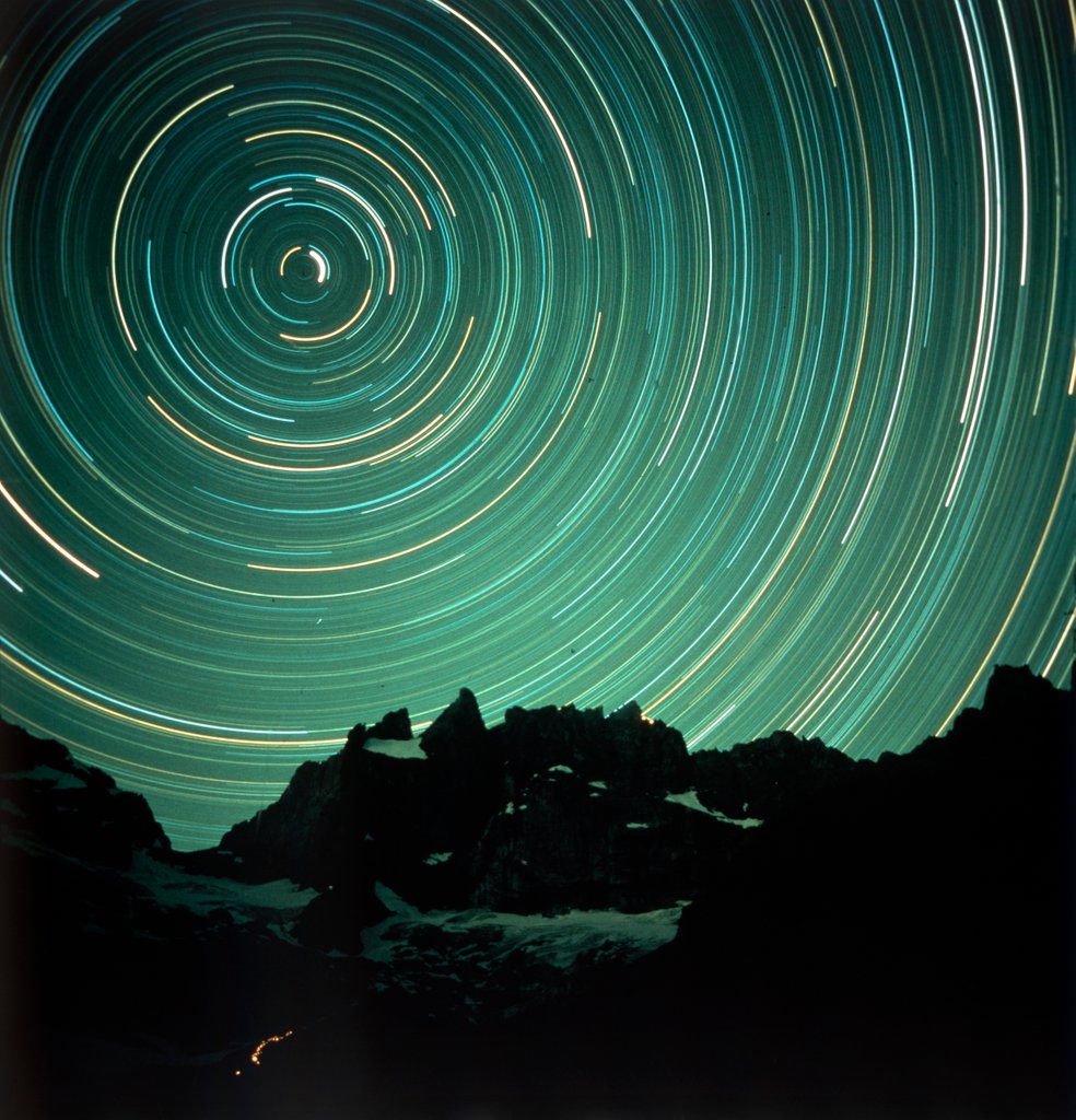 Light effects over La Meije, France. Long-exposure image of stars over the Massif des Écrins in south-eastern France.