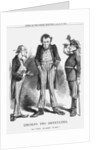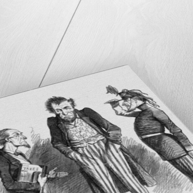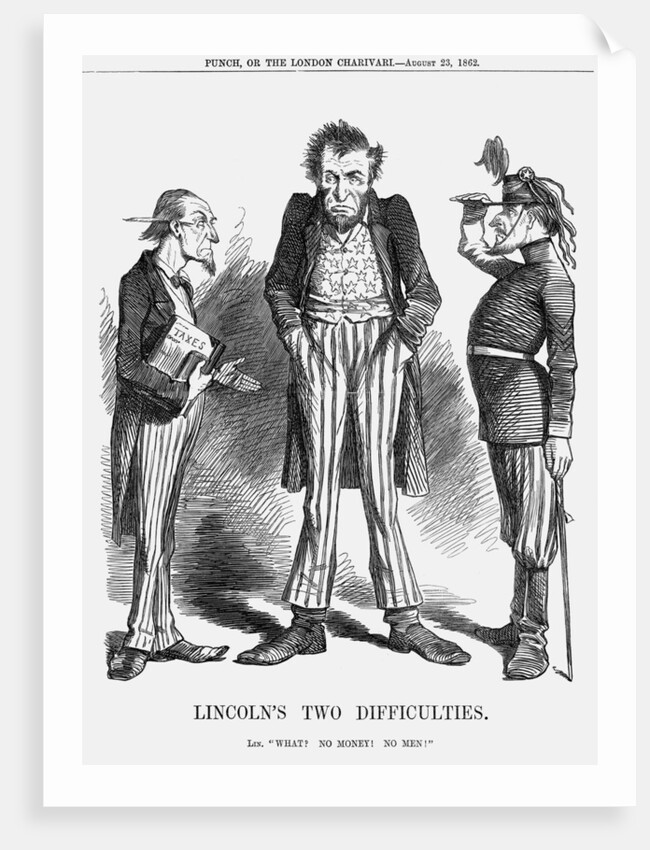 'Lincoln's Two Difficulties', 1862. Lincoln comments: What? No Money! No Men! President Lincoln was calling for a second draught of 300,000 men to be called into service from the militia for a period of nine months. He was having great difficulties in persuading sufficient men to volunteer, and the public debt was growing rapidly. At this time, it is estimated to have been in excess of $1,222,000,000. So, in this cartoon, a glum Lincoln, hands thrust into empty pockets, is being told that he has no men, and there is no money. From Punch, or the London Charivari, August 23, 1862.