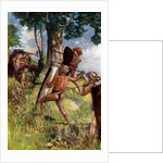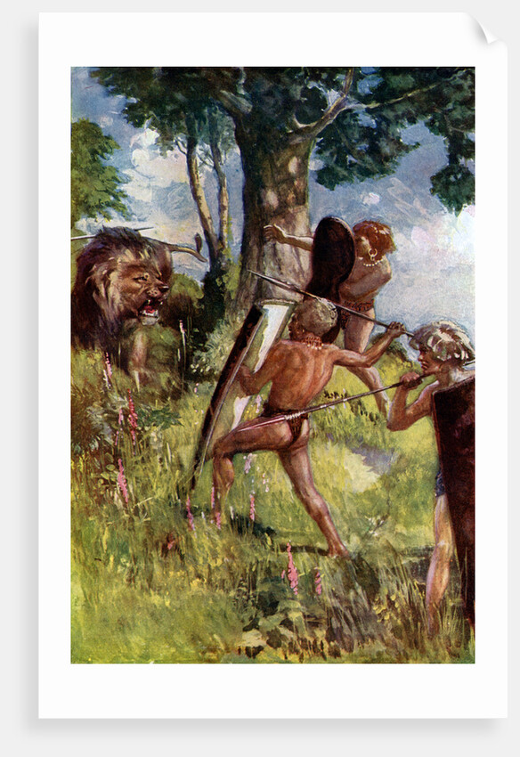 Lion hunters of the European Bronze Age, (c1920). Based on a representation of a lion hunt inlaid upon the blade of a dagger found at Mycenae. Illustration from Story of the British Nation, Volume I, by Walter Hutchinson, (London, c1920s).