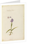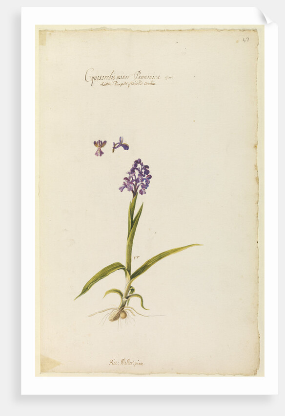 Botanical study of little purple flowered orchid (Cynosorchis minor pannonicai) with flower details.
