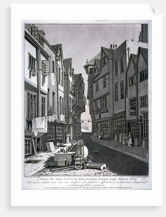 Little Sanctuary, Westminster, London, 1807. View of Little Sanctuary, Westminster, from the west end showing clothes hanging out to dry and house furniture in the road.