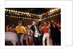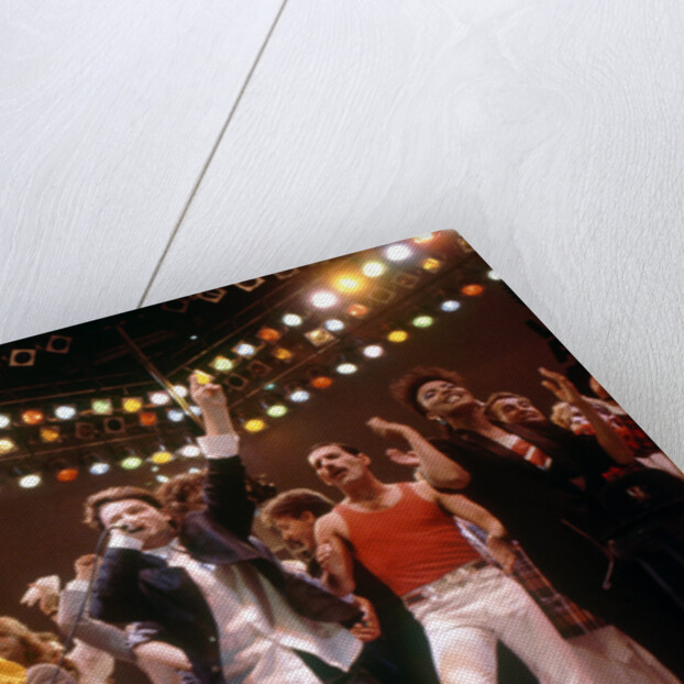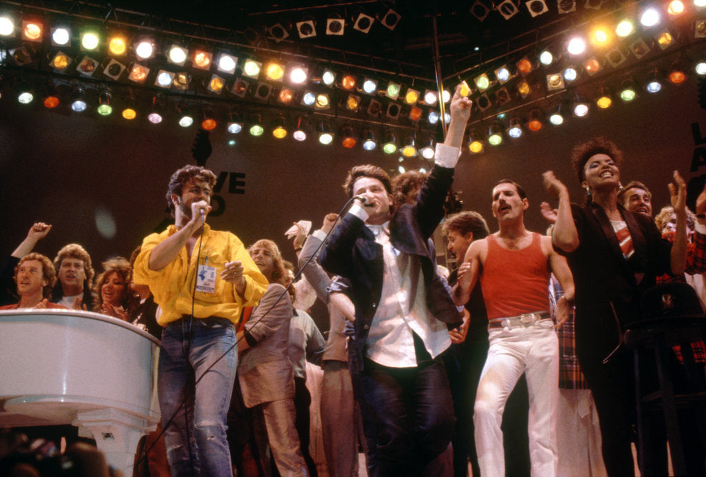 Live Aid concert at Wembley Stadium. All the stars on the stage at the end for the grand finale including George Michael, U2 lead singer Bono and Queen frontman Freddie Mercury. 13th July 1985.
