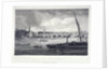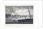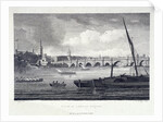 View of the west side of old London Bridge, London, 1798; with the Monument on the left hand side of the sky line and the Tower of London just visible on the far right of the sky line. Barges are moored in the foreground on the right and smaller vessels move about on the river.