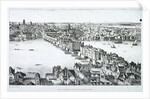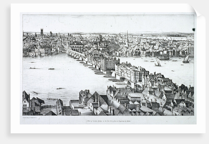 Aerial view of London Bridge, London, c1830 showing how the Bridge, the River Thames and surrounding buildings on both riverbanks looked in 1647.