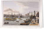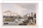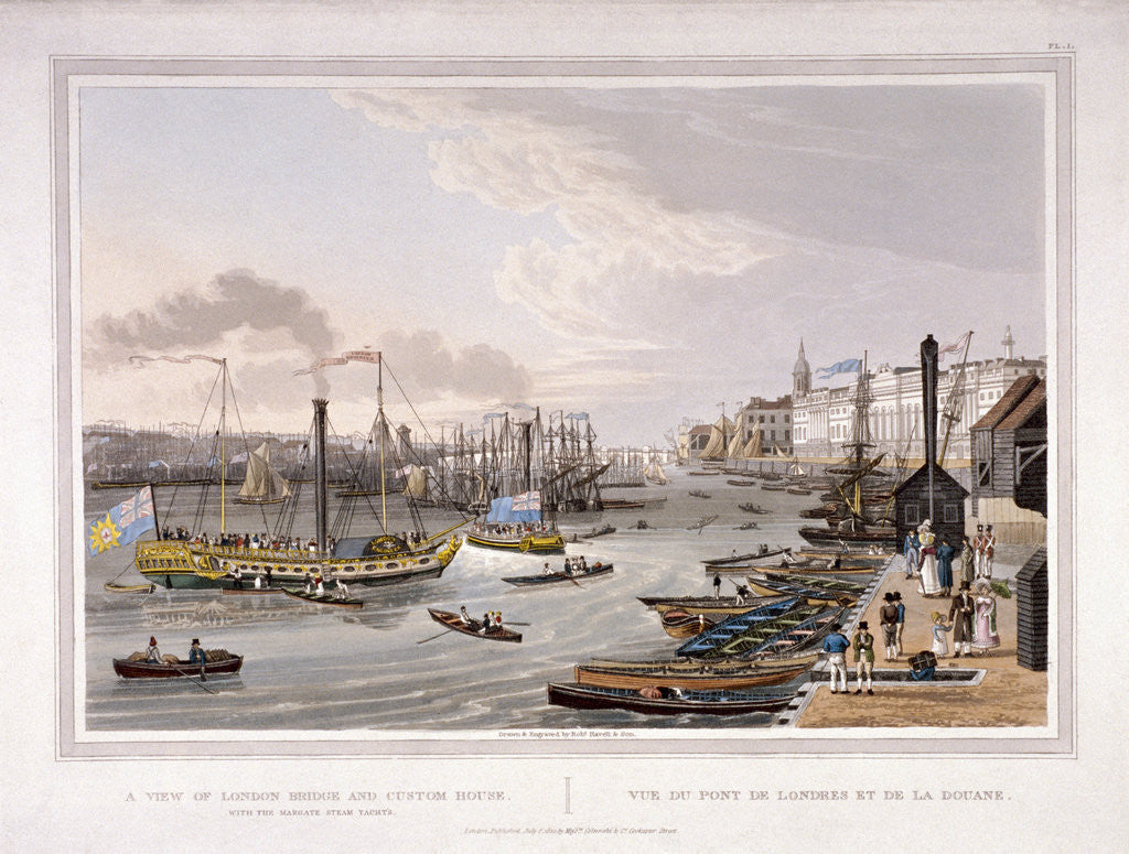 View of old London Bridge, London, 1820. On the left is the Custom House, with Margate steam yachts and other boats on the River Thames in the foreground.