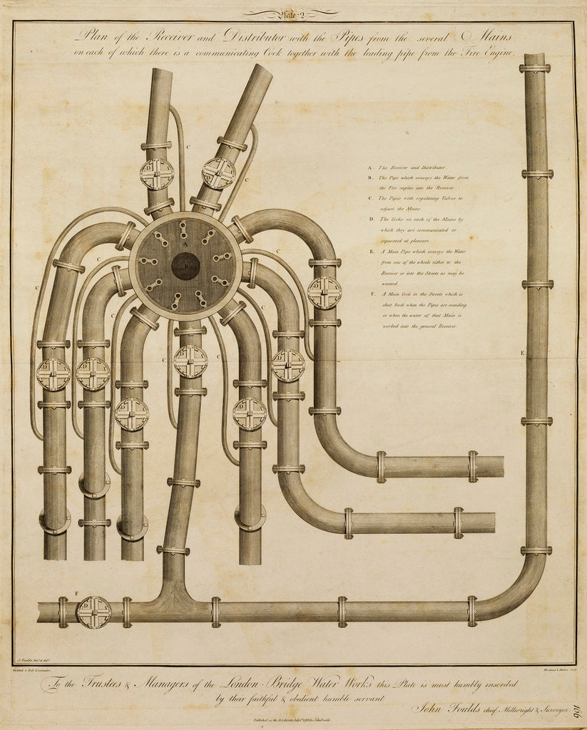 Design for the steam engine for London Bridge Water Works by John T. Foulds, millwright and surveyor. Plan of the receiver and distributor. From Smeaton volume 2, fol. 165v.